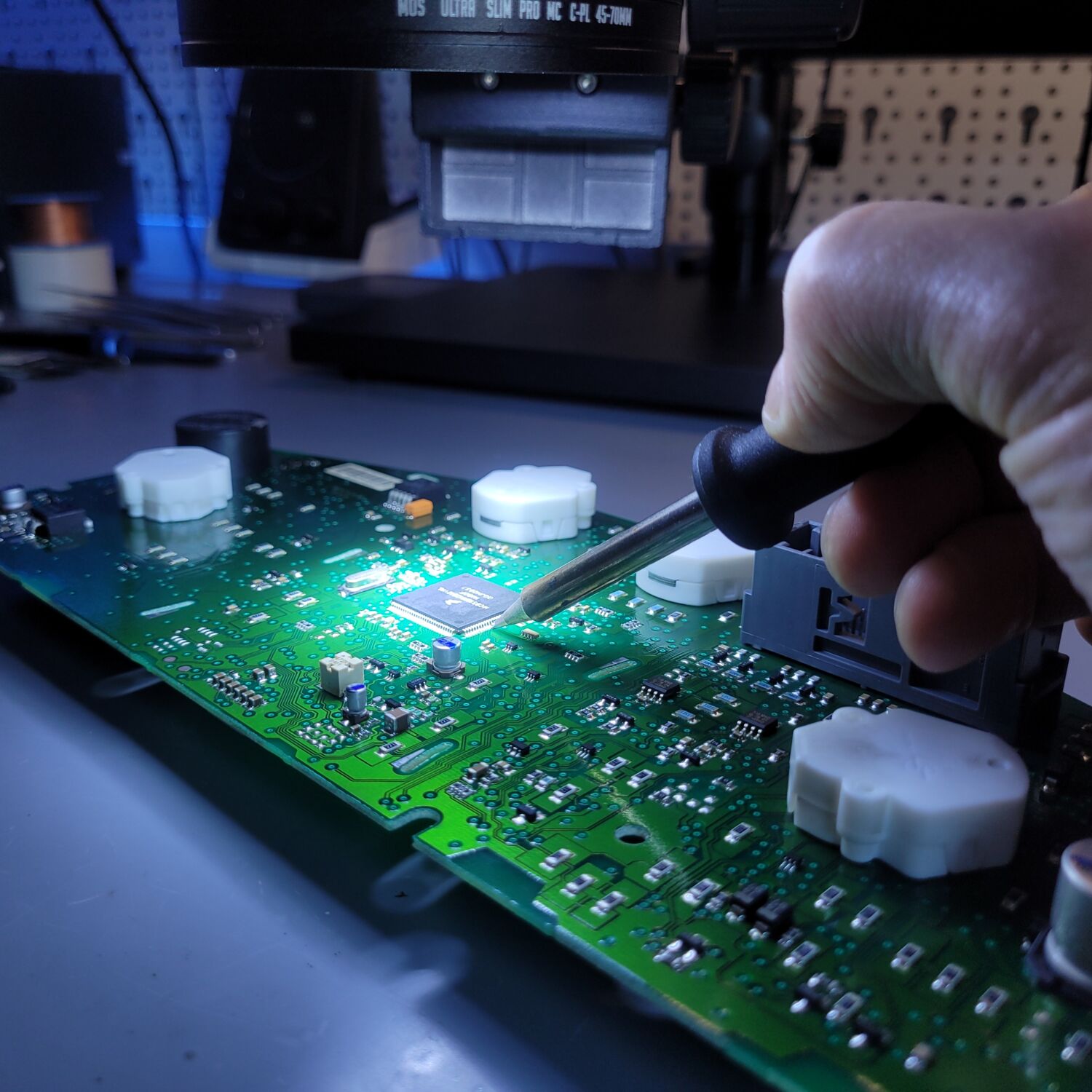 Pod mikroskopem lub przy pomocy specjalistycznych narzędzi lokalizujemy uszkodzone połączenia na płytce drukowanej.